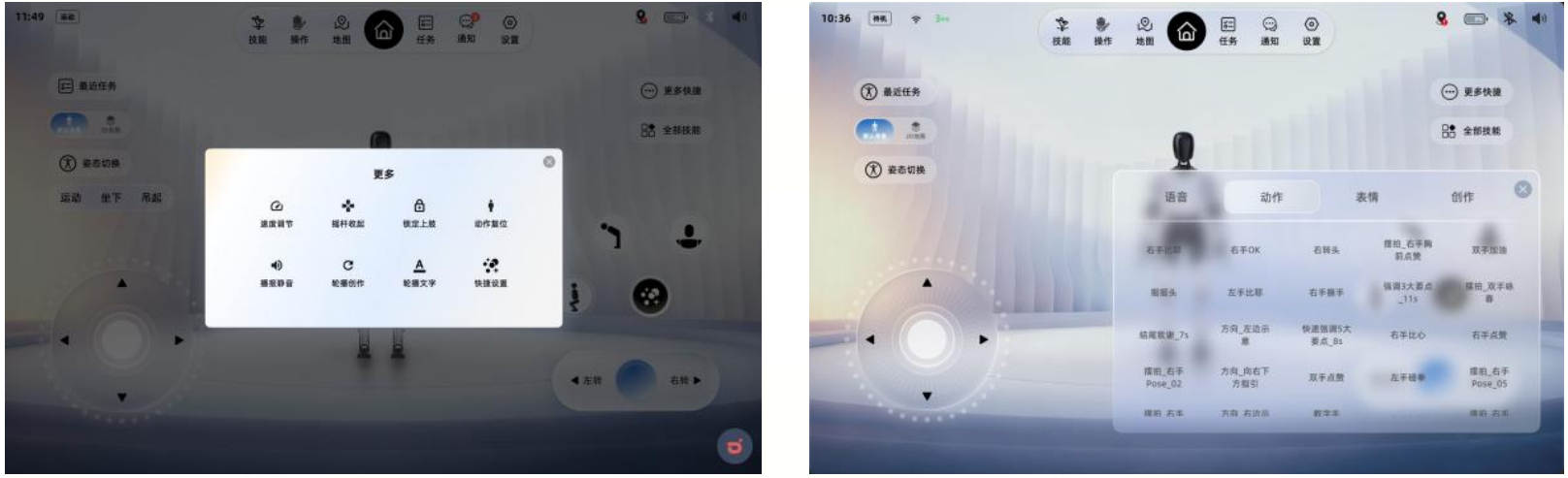AimMaster首页,点击姿态切换按钮,可选择切换至运动坐下吊起三种模式。在运动模式下,点击蓝框内三个图标分别控制机器人下蹲、弯腰以及头部动作。点击下图蓝框内圆形按钮并旋转,可控制机器人完成指定动作。